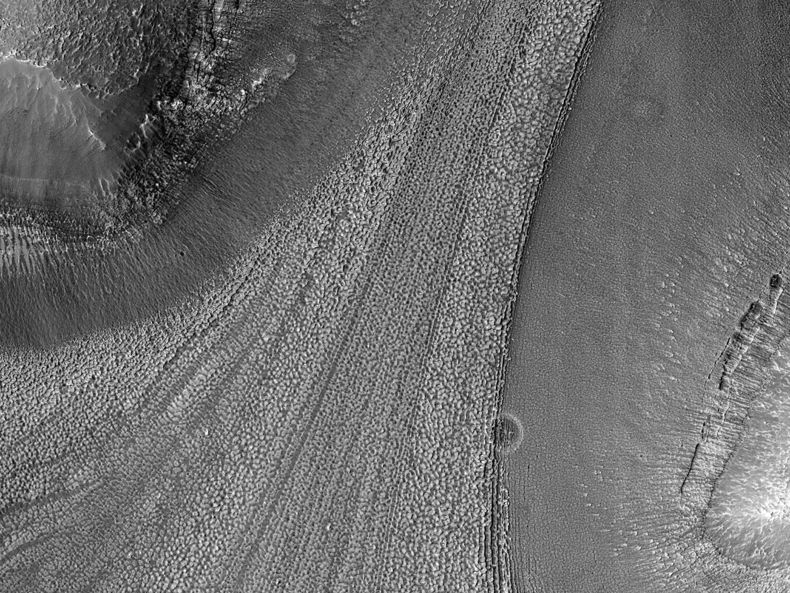 Національне управління з аеронавтики і дослідження космічного простору США опублікувало зображення, яке в серпні отримав орбітальний апарат Mars Reconnaissance Orbiter (MRO). На знімку видно ребристі лінії на поверхні Червоної планети, залишені льодом.