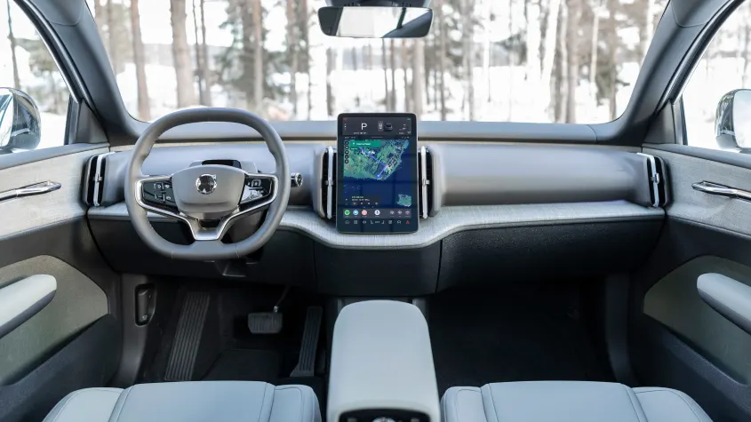 Всередині автомобіль зберіг знайому архітектуру EX30, з 12,3-дюймовим вертикальним екраном мультимедійної системи на базі Google. Volvo додала низку оновлень, зокрема покращене розпізнавання голосових команд, підтримку Apple CarPlay та можливість роботи камери 360° без увімкнення передачі. Салон представлений у двох варіантах: Pine (з вовняною та Nordico-оббивкою) і Indigo (з переробленого деніму).