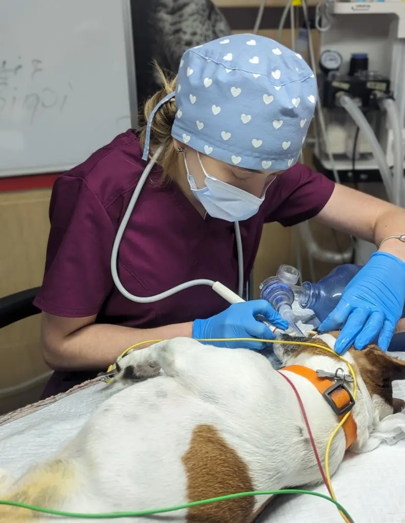 Звісно, перший та головний етап – ультразвукове чищення зубів собаці. Стоматолог-ветеринар видаляє камінь з поверхні зубів та під яснами, де ховається основне джерело проблеми. Після цього кожен зуб оцінюється окремо. Чи він стабільний, наскільки постраждав, що з коренем, чи є глибокі пародонтальні кишені. Це важливий момент, адже зовні зуб може виглядати нормально, але фактично вже не триматися в щелепі.