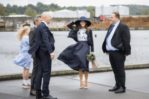 Королева Мері була одягнена у небесно-блакитну драповану шовково-шифонову блузку від Proenza Schouler та синю жакардову спідницю в дрібний горох зі смугастою підкладкою від Baum und Pferdgarten. Під час прогулянки вітер підняв спідницю королеви, що змусило її посміхнутися, коли вона намагалася одночасно втримати і свій капелюх.